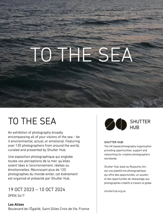 Excited to be invited ‘To The Sea’, a photographic exhibition and outdoor installation on the French coast curated and presented by Shutter Hub. The exhibition features 120 international photographers and will run from 19th October 2023 – 10th October 2024 – plenty of time to set sail or plan a detour to the Boulevard de l’Egalite, Saint Gilles Croix de Vie to enjoy environmental, emotional and inspiring images of the ocean.